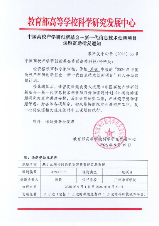 2025近日,由人工智能学院周锐科研团队申报的中国高校产学研创新基金—新一代信息技术创新项目“基于云端协同的起重装备智能监测系统”正式获批立项。该项目由教育部高等学校科学研究发展中心批准立项,是我校首次获批此类基金项目。项目面向新一代信息技术发展趋势,聚焦起重装备在实际工程中的智能化、信息化与系统协同等关键问题,旨在通过校企协同攻关,推动技术创新与成果转化。(信息技术创新项目课题资助批复)此次立项是我...