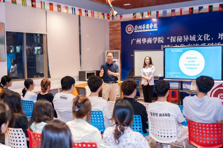 当晚,代表团与我校国际学院学生进行了见面交流。王文忠处长鼓励学生们把握此次交流机会,并表示两校的双校园、双学位联合培养项目将帮助同学们练就专业本领,拓展国际视野,提升国际竞争力。主讲人杨冬玥博士在交流会上介绍堪培拉大学的教学资源、学习与生活环境、学费奖学金、就业指导、丰富的实习机会以及高就业率等优势。在问答环节,代表团耐心解答了同学们关心的奖学金、语言要求等赴澳留学相关问题,现场气氛活跃。