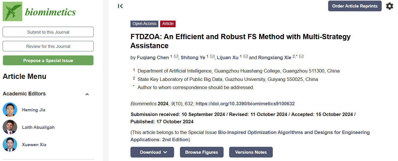 近日,人工智能学院教师陈富强以第一作者身份在《Biomimetics》期刊发表了题为“FTDZOA:An Efficient and Robust FS Method with Multi-Strategy Assistance”的论文,该期刊属于SCIE检索期刊,是JCR Q1分区,中科院三区。