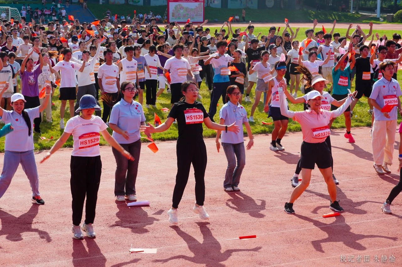 在体育学院教师的带领下,师生共同进行热身准备活动,从摆臂伸展到跳跃拉伸,从马步压腿到体转放松,每一个动作都洋溢着青春的活力。