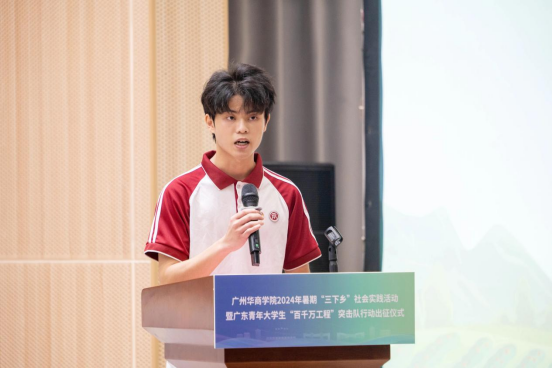 指导老师代表何以立发言。他代表即将出征的指导老师郑重承诺,将秉持奉献意识,积极引导学生开展实践社会实践工作,带领实践队员在实践中互帮互助,锤炼思想,提升自我能力。他表示,将在实践中树立优良组织形象,向社会各界展示华商学子积极向上的精神风貌,切实提高本次活动的覆盖面和影响力,服务广大华商学子成长成才。
