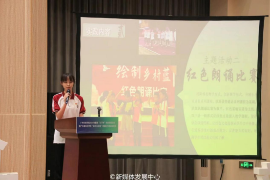 2023年广东青年大学生“百千万工程”突击队行动项目代表朱子希作经验分享。她讲述了青衿萤火实践团往年社会实践活动的完成情况,以及在实践中获得的成就和荣誉。实践过程中,青衿萤火实践团深入乡村,开展活动,被多家主流媒体报道,推送阅览量超16万人次,展现了华商青年用脚步丈量乡间田野、用双手助力乡村振兴的担当与作为。
