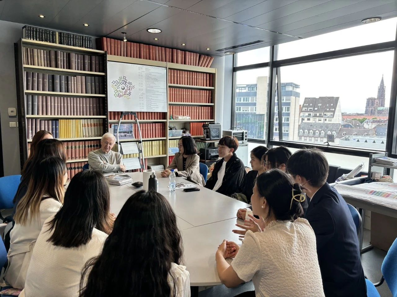 我校名誉校长、诺贝尔奖获得者Jean-Marie Lehn教授在斯特拉斯堡大学的超分子实验室与大家亲切会面。同学们向Lehn教授请教了许多问题,Lehn教授逐一详细回答。Lehn教授鼓励大家,想象是发现的本质,而想象源于好奇心。交谈中,同学们和Lehn教授畅谈中西方饮食、文化、音乐等话题,分享了自己的梦想及规划,并向Lehn教授送上自己精心准备的小礼物,表达敬意。超分子实验室的杨博士引导同学们参观超分子实验室,详细介绍他们研究项目的进展情况。