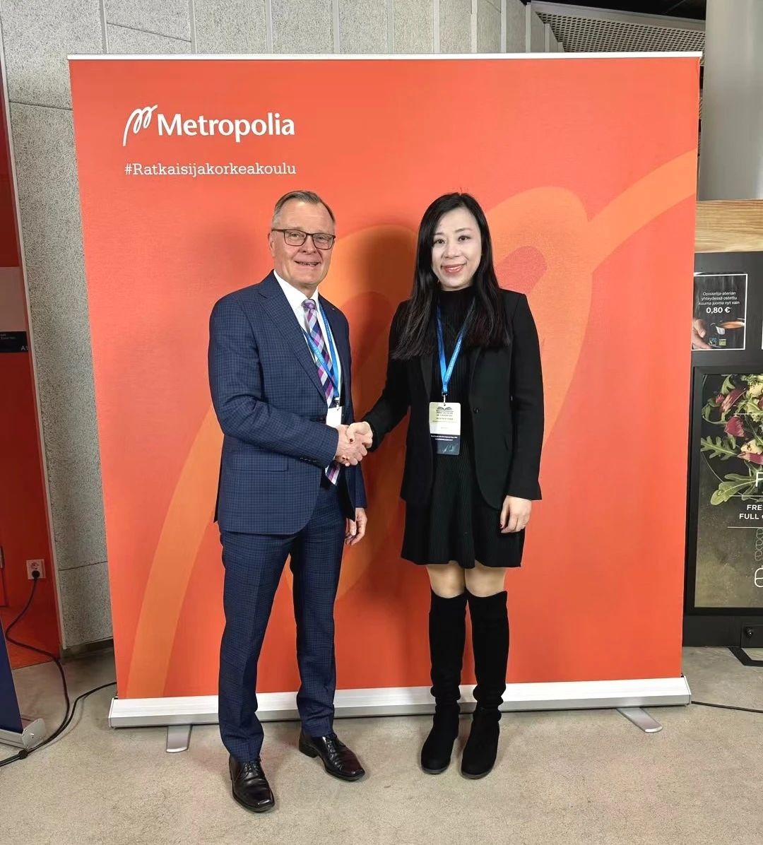 (我校副校长廖伊曼博士与芬兰应用科学大学校长联盟主席Riitta Konkola博士合影)