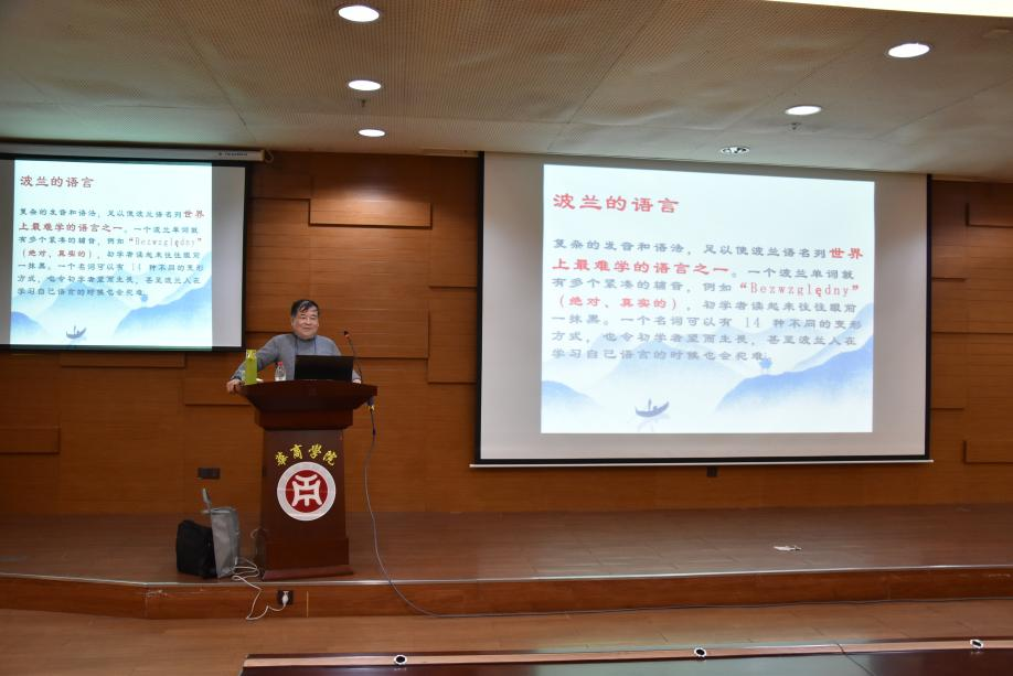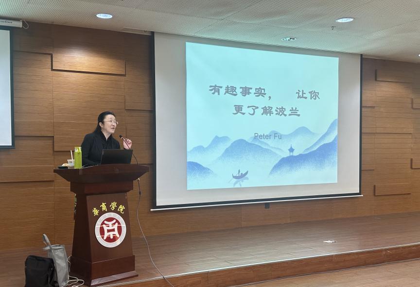 傅志刚教授首先讲述了波兰国旗、国徽的象征意义以及被强国包围的特殊地理位置所培养出的顽强民族特性。随后,他借助图片展示了波兰的婚俗、美酒和美食,尤其介绍到马蹄型甜甜圈的时候,引出了16世纪为了纪念波兰国王率领的基督教军团战胜奥斯曼土耳其入侵的故事。最令大家印象深刻的是对“取名日”的纪念,甚至比庆祝生日还隆重。