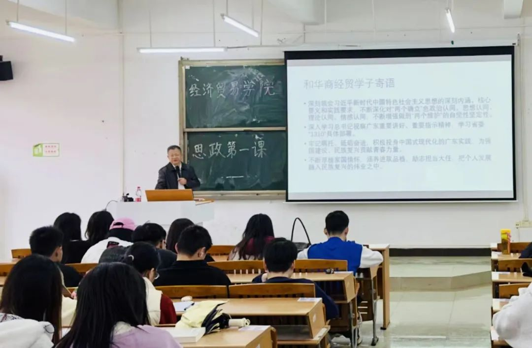 2024年3月5日,经济贸易学院李广明院长在广州校区励志楼C402为经济贸易学院2021级学生讲授以“踔厉奋发,学好本领,积极投身高质量发展的广东实践”为主题的思政第一课。李广明院长以“人勤春来早”开篇,带领同学们学习全省高质量发展大会相关内容,引导同学们学习领会“以高质量发展推进中国式现代化”的深刻内涵。生产力是社会发展的最终决定力量,推进现代化建设最重要的是发展高度发达的生产力。习近平总书记强调发展新质生产力是推动高质量发展的内在要求和重要着力点。新质生产力的特点是创新,关键在质优,本质是先进生产力。