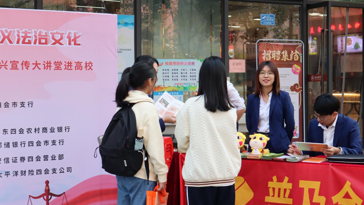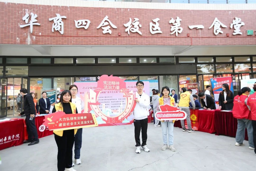 ——线下摆摊地推活动。各活动单位以“大力弘扬宪法精神,建设社会主义法治文化”为主题,在我校肇庆校区第一食堂门口开展“12·4”国家宪法日暨宪法宣传周集中宣传活动。肇庆市金融消费权益保护联合会、中国人民银行四会市支行、共青团四会市委员会、四会市金融行业协会、广东四会农村商业银行参与单位:建行四会支行及部分金融机构代表参与本次活动。