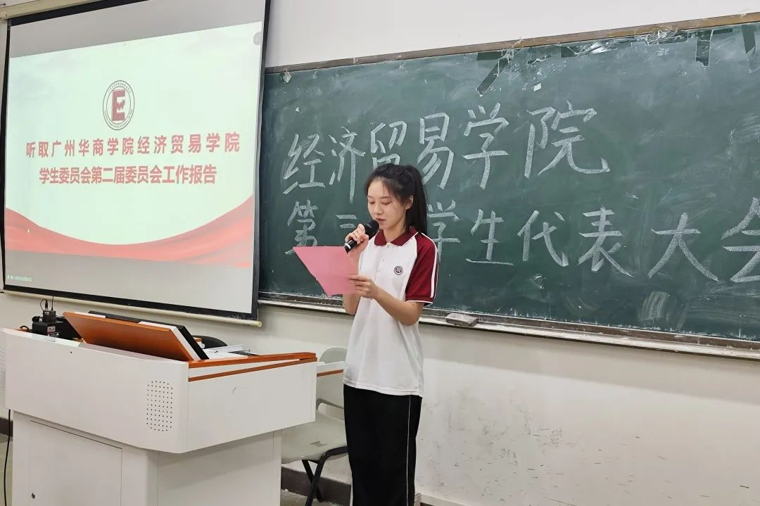 由伟德体育经济贸易学院第二届主席团成员郑薇同学进行伟德体育经济贸易学院第二届学生委员会工作报告。