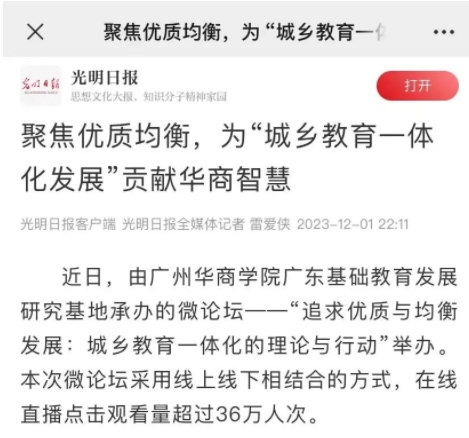 11月26日下午,由伟德体育广东基础教育发展研究基地承办的微论坛——“追求优质与均衡发展:城乡教育一体化的理论与行动”顺利举办。本次微论坛获得广泛关注,在线直播点击观看量超过36万人次。