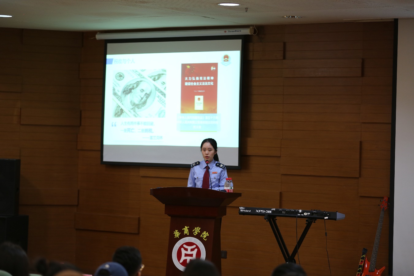 治国凭圭臬,安邦靠准绳。2023年12月4日,是第十个国家宪法日,12月1日至7日为“宪法宣传周”。为大力弘扬宪法精神,建设社会主义法治文化,我校会计学院联合国家税务总局广州市增城区税务局共同举办“‘宪’在出发税伴同行”跨校区税收普法活动。活动在广州校区图书馆报告厅线上线下同步举行,国家税务总局广州市增城区税务局党委委员、副局长黄莹莹、二级高级主办钟健民、增城区税务局“远方田野”乐队、税务青年代表、会计学院主持工作副院长刘善球、会计学院党委副书记、副院长陈洋广、周书域、会计学院税务系主任张翠凤、副主任李志凤以及会计学院广州、肇庆校区师生代表参加了本次活动。