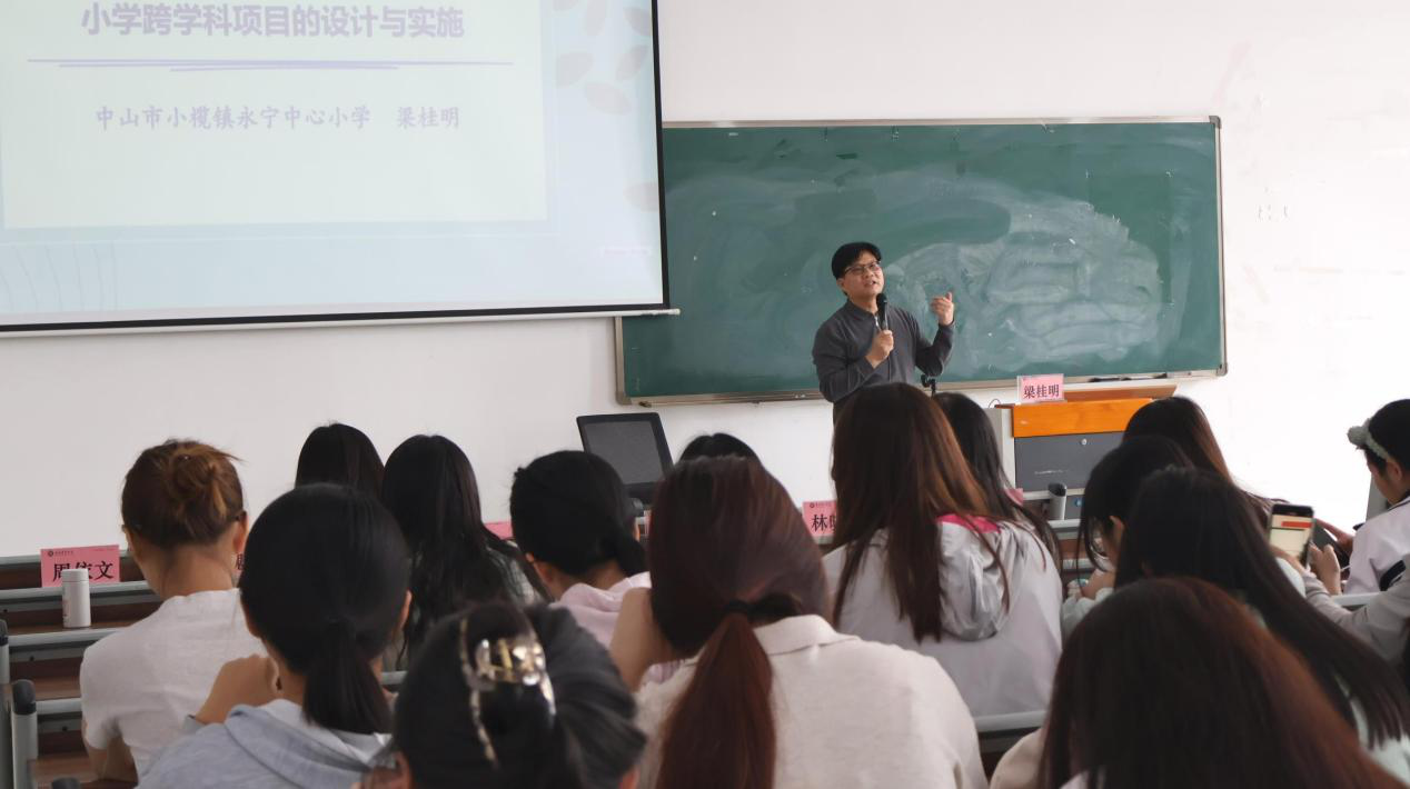 2025年4月8日下午,伟德国际betvlctor在肇庆校区6号楼203、205和206教室开展“融创共生:小学跨学科项目设计与实施新路径”专题讲座。中山市优秀教师、小学数学科研专家库专家梁桂明为2023级小学教育专业800余名师生带来了一场教育创新的思想盛宴。