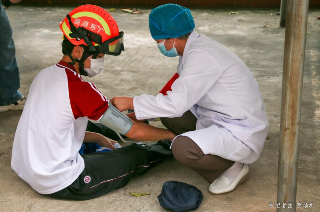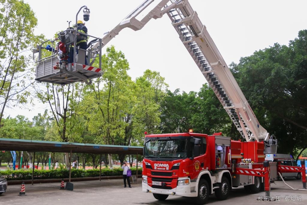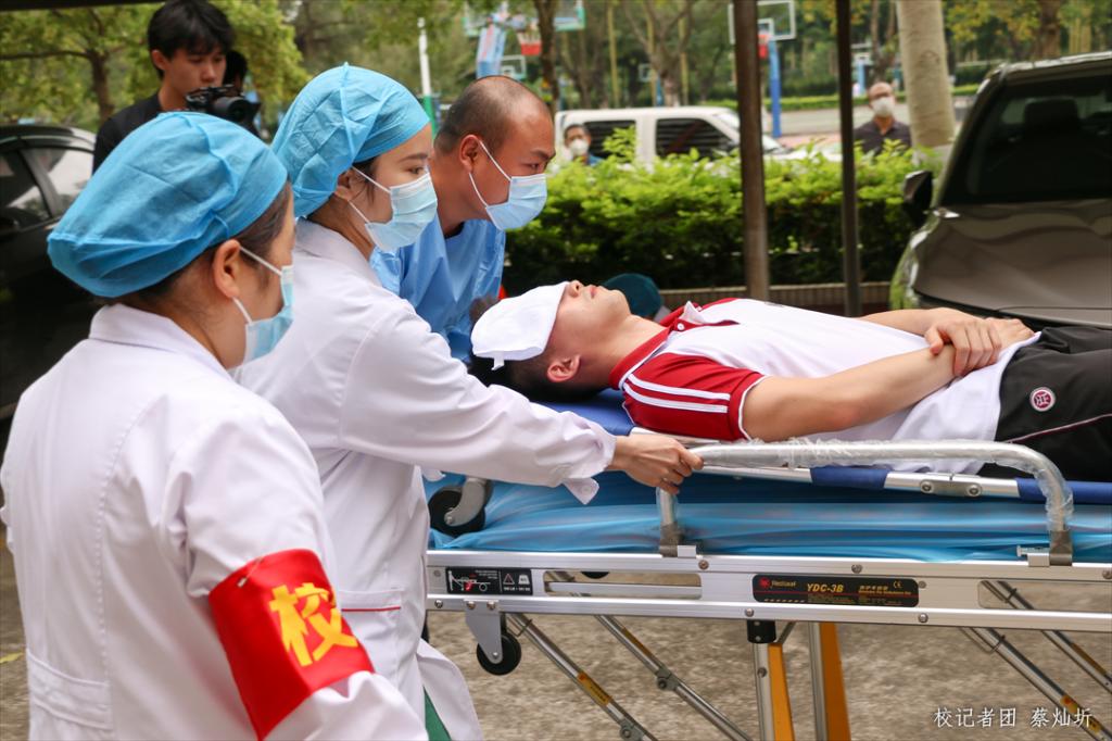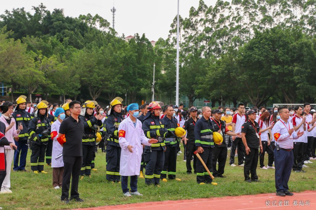 消防演练分为,报火警、紧急疏散、灭火救援、确认安全四个环节。通过放烟雾弹模拟宿舍着火的场景开始本次消防演练。会议中心527宿舍王同学被烟呛醒并呼叫其他同学起床灭火,其中2人使用灭火器灭火,另一人按响消防警铃。消防警铃响起,消防中心经确认火情后报告应急值班干部,总指挥下达立即启动消防应急预案指令。学校消防队员到达火灾现场,立即组织各宿舍人员听从指挥有序疏散,同时进行灭火。人员基本疏散到位后发现有2名人员下落不明。增城消防救援队赶到火灾发生地点,立即开展灭火和人员营救。经过消防员的奋力营救,1名受困人员被救下,医疗救护组立刻进行了问询与诊断并安抚,安排到就近阴凉处休息观察。与此同时,另一名被困人员已被消防员营救,用担架抬出来。学校校医感到现场第一时间对伤员进行查看,初步诊断为右脚骨折,现场进行包扎后,等待120急救车转运医院进行进一步处理。