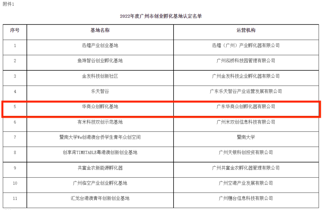 近日,根据广州市人力资源和社会保障局《2022年度广州市创业孵化基地认定和评价结果的公示》,华商众创孵化基地成功被认定为市级创业孵化基地。