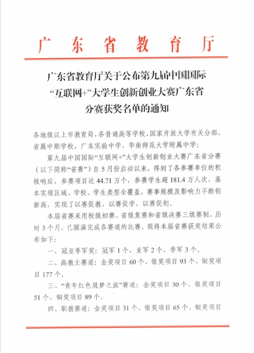 第九届中国国际“互联网+”大学生创新创业大赛广东省分赛(以下简称“省赛”)自5月份启动以来,得到了各参赛单位的积极响应,我校紧密围绕大赛提出的“更中国、更国际、更教育、更全面、更创新、更协同”的要求,认真筹划、积极组织,落实立德树人根本任务,传承和弘扬红色基因,聚焦“五育”融合创新创业教育实践。学校领导、各相关部门、各学院高度重视和大力支持,多次开展相关讲座及辅导培训,激发我校学生的创新创造热情,深度挖掘培育优秀的创新创业项目,不断提升参赛项目的质量和水平。