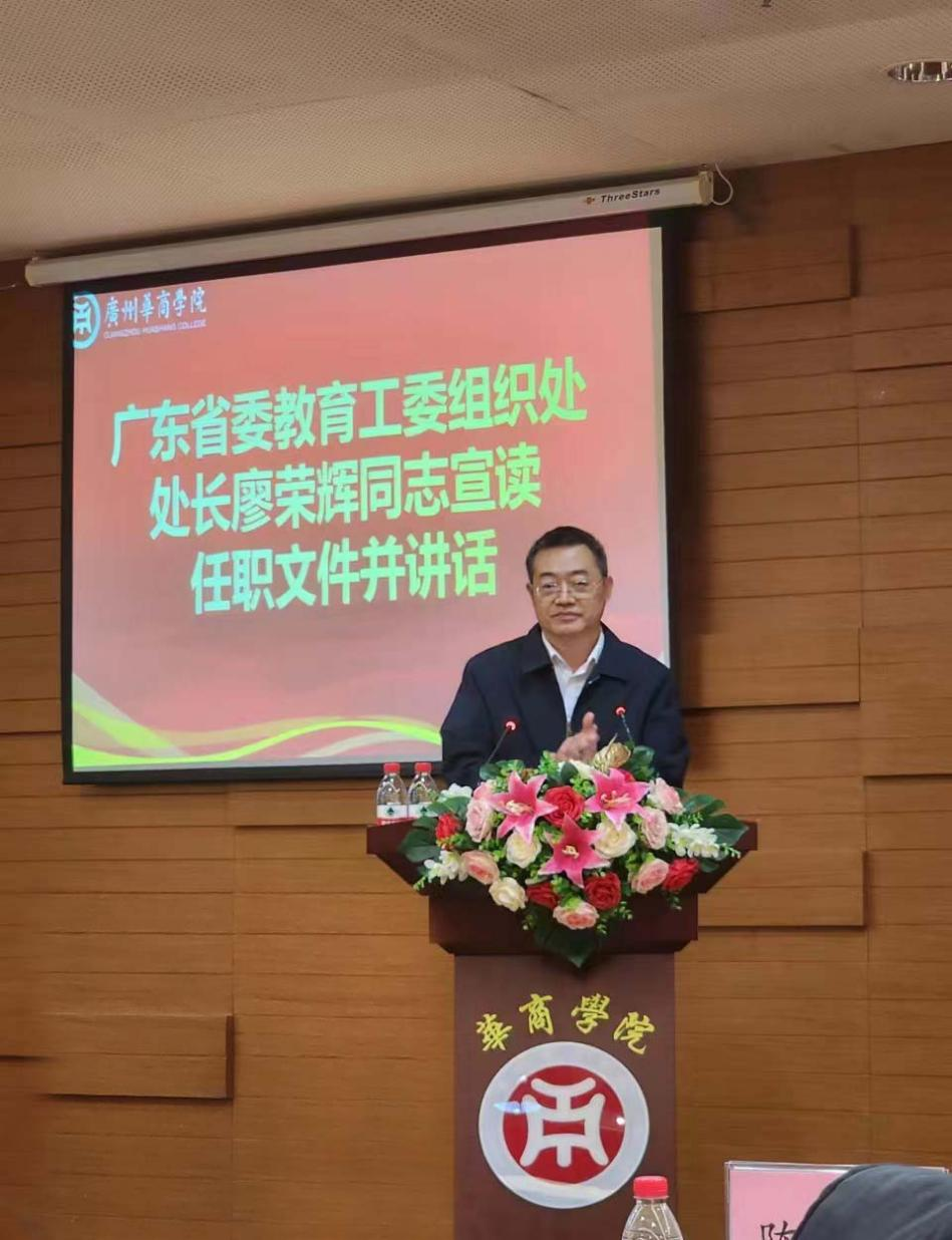 省委教育工委组织处廖荣辉处长宣读任职文件并讲话。廖处长宣布,经中共广东省委教育工作委员会、广东省教育厅研究决定,陈玉欢同志任伟德体育党委书记兼督导专员。