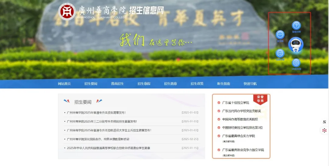 方式二:伟德体育招生信息网登录伟德体育招生信息网(网址:https://zs.gdhsc.edu.cn/),点击右侧“智能机器人小招”,在登录界面完善基础信息后即可在线咨询或留言。