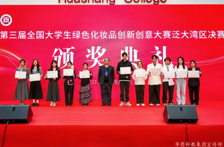 经过上午激烈的角逐,众多优秀团队凭借在原料创新、配方设计、包装设计等方面的出色表现脱颖而出。大赛颁奖环节共表彰荣誉奖、优秀奖、一至三等奖等120余个团队,华商参赛项目“岭南植物多酚抗衰护肤品”“可降解竹纤维美妆包装”分获原料创新与包装设计赛道一等奖,彰显了学校专业教学与实践创新的成效。在热烈的掌声中,获奖团队代表依次上台领奖,由出席嘉宾为他们颁发荣誉证书,这不仅是对参赛团队的高度认可,也激励着更多学生投身绿色化妆品创新领域。