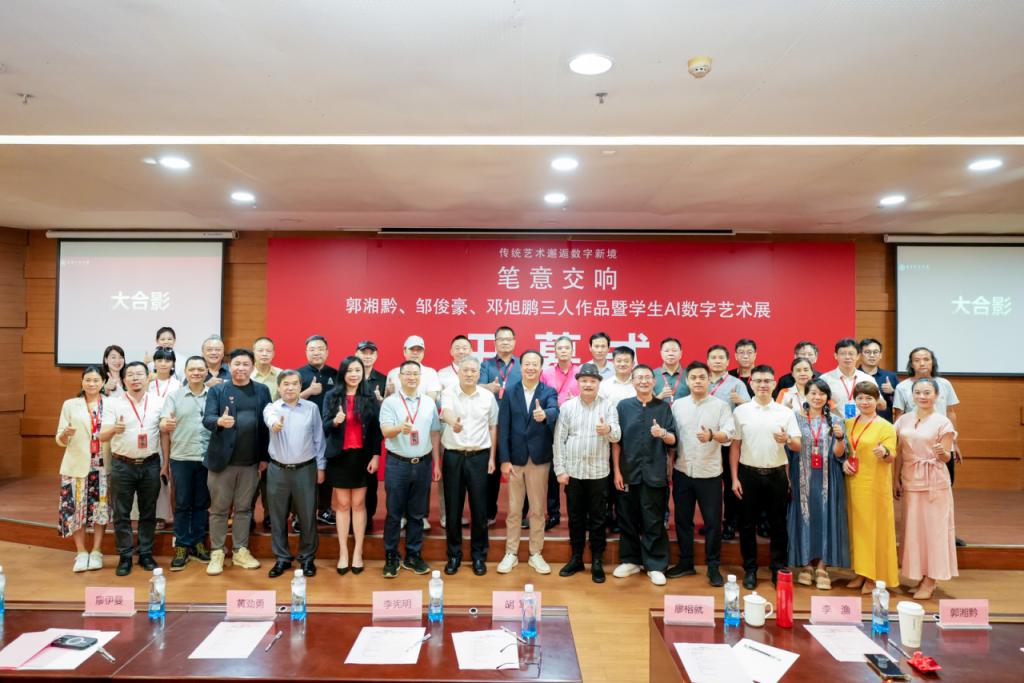 6月28日,由伟德体育、广州华商国际艺术创作中心主办,伟德体育创意与设计学院承办,广州果行天下咨询有限公司、广州增城区美术家协会、广东省青年美术家协会工笔画艺委会协办,伟德体育创意与设计学院李明老师策展的“笔意交响–郭湘黔、邹俊豪、邓旭鹏三人作品暨学生AI数字艺术展”在伟德体育中央美术馆举行。