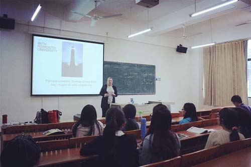 会后,英国普利茅斯大学代表在励志楼D101举行了专题讲座。幽默风趣的Nicola Seth结合精彩的视频和图片向同学们介绍了普利茅斯大学的地理位置、校园环境、学生生活等。接着Miko Zhang详细地介绍了普利茅斯大学夏令营项目,并热情地回答同学们的提问。讲座的最后,Miko向在座同学发放纪念品,并邀请同学们到英国普利茅斯大学体验和学习。(文/华商合作交流中心叶炎玲)