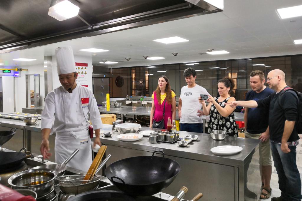 ▲李绪彬老师为外教们展示中餐烹饪