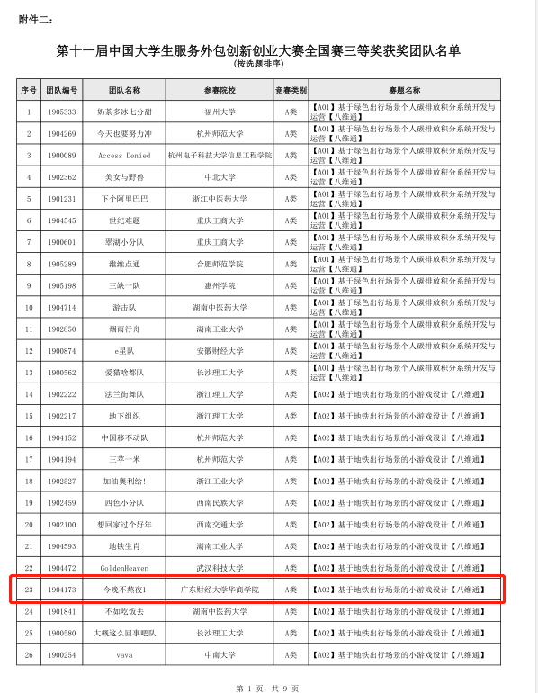 近日,第十一届中国大学生服务外包创新创业大赛组委会公布全国赛决赛晋级及三等奖获奖名单公告,我校有两支队伍再创佳绩,“快乐就完事”成功晋级全国总决赛角逐一、二等奖,“今晚不熬夜1”队获得全国赛三等奖。