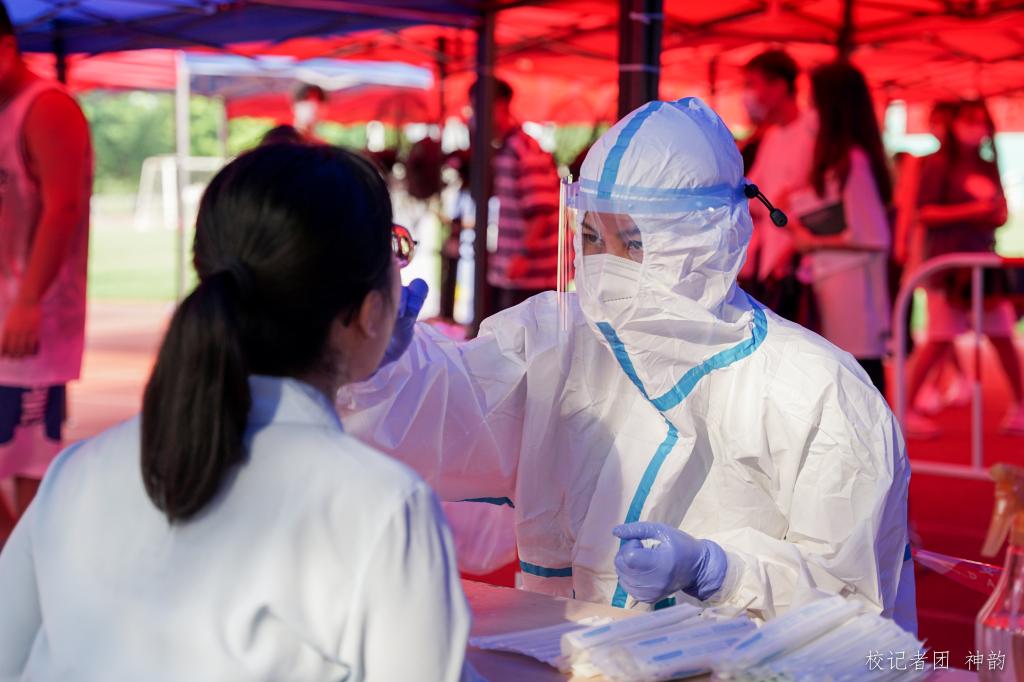 检测现场,大棚内身着白色防护服的医护人员熟练地进行咽拭子标本采集工作,后勤警卫员维持着检测会场的秩序,志愿者们身着红色马甲疏导前来检测的人员筑成坚实后盾。参与检测的师生积极配合现场工作人员展开工作,在志愿者的指引下有序排好队伍、紧跟检测流程,检测现场井然有序。