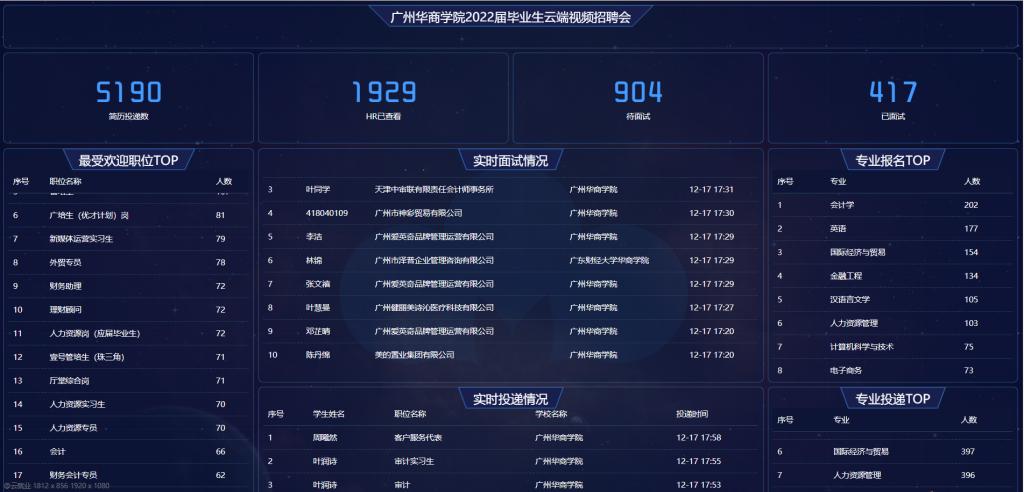 本次2022届毕业生“华商+云端”招聘会为我校毕业生提供超3703个岗位,总需求人数约达4.3万人,在严峻的就业环境下,大力缓解了毕业生的就业压力。
