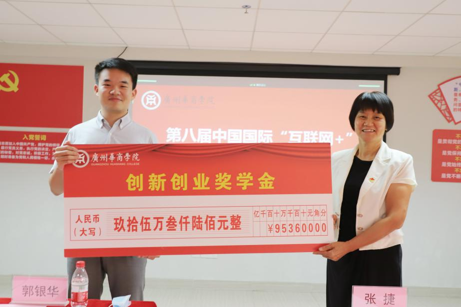 郭银华执行校长和苏宁书记为在第七届中国国际“互联网+”大学生创新创业大赛省赛中荣获银奖和铜奖的团队颁发荣誉证书。王锦秀副校长为获得创新创业奖学金的学生代表颁发奖金。