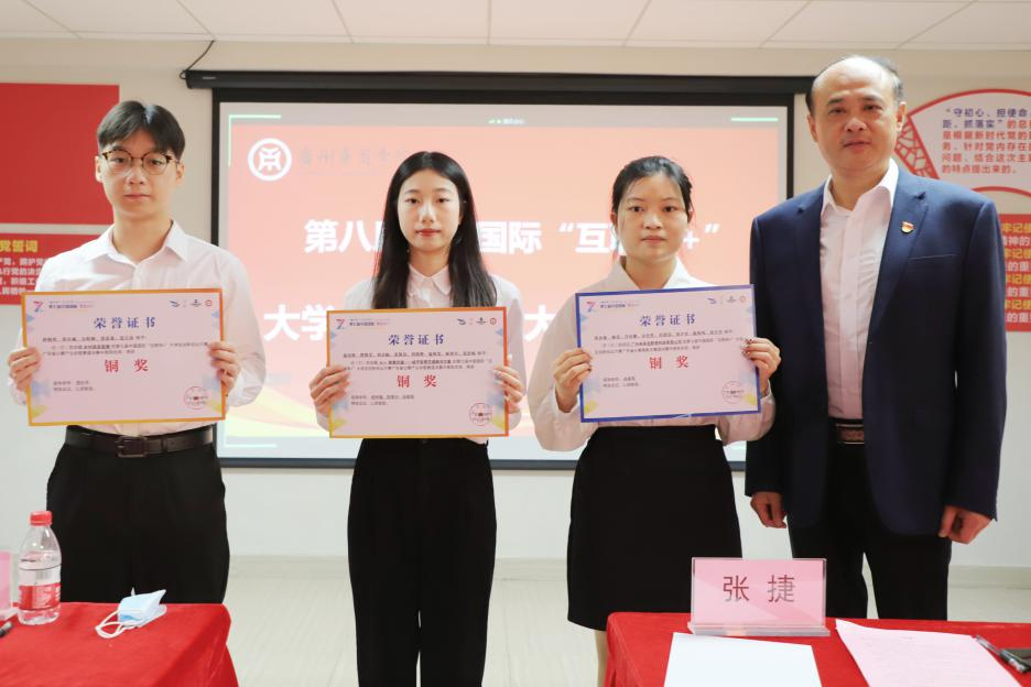 郭银华执行校长为荣获第七届“互联网+”省赛银奖团队颁发荣誉证书