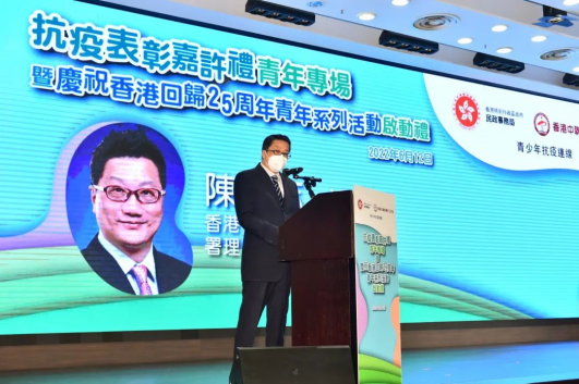 香港中联办青年工作部部长张志华通过视频方式致辞时提到,第五波疫情以来,青年团体勇于担当,站在第一线,彰显了青年力量,体现了风雨同舟、同心抗疫的强大力量,还举办了庆回归青年活动启动礼,在民政事务局的支持下,香港青年团体组织了超过两百项青年活动,以“香港开新篇,青年创未来”为主题,为庆回归25周年添上浓墨重彩的一笔,希望香港青年拥抱新时代,抓住新机遇,共创新未来。
