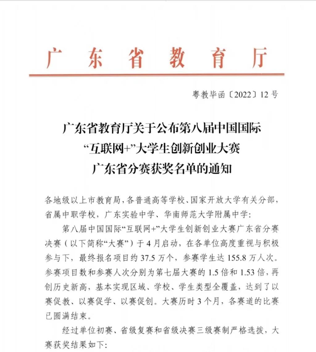 近日,第八届中国国际“互联网+”大学生创新创业大赛广东省分赛(粤教毕函【2022】12号)获奖名单公布,我校《稚影传媒—融媒体世界领跑者》和《中健领航--多维度智慧校园综合解决方案》两个项目获省赛铜奖。
