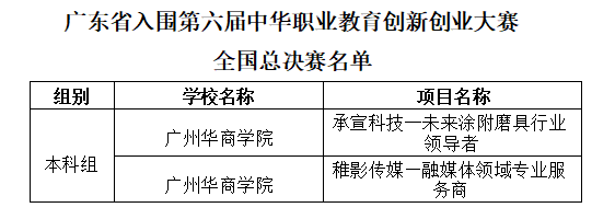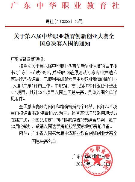 12月13日,广东中华职业教育社公布第六届中华职业教育创新创业大赛全国总决赛入围名单,伟德体育“承宣科技一未来涂附磨具行业领导者”“稚影传媒—融媒体领域专业服务商”两个项目成功入围全国总决赛。