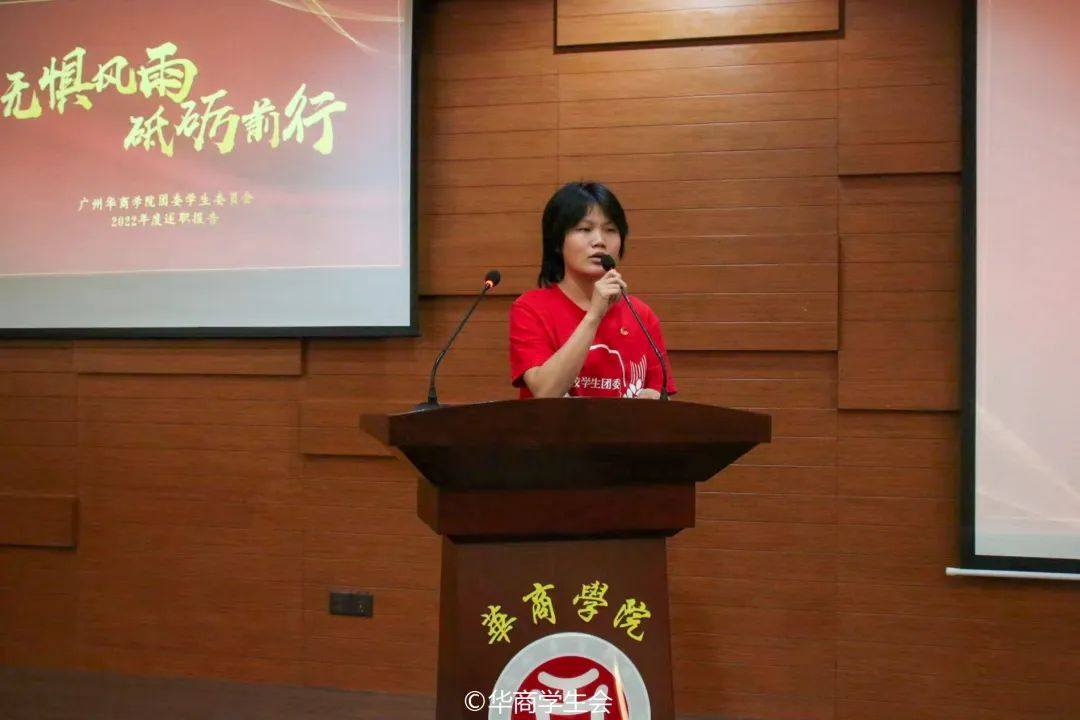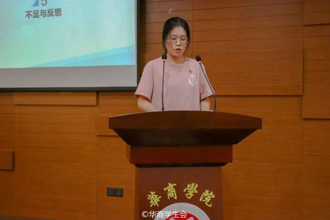 校华商之声广播电视台常委团成员廖颖琪作述职汇报。校华商之声广播电视台是华商青年的发声地,在过去一年成功举办第九届王牌MC主持人大赛、第十届主持人内部选拔大赛,同时负责校内各大小型活动的主持以及周一至周五的校园广播,为热爱舞台与播音主持的同学提供展现风采的舞台,丰富华商学子的校园生活。在输出本台文化的同时,也在致力于打造更加有思想、有温度、有品质的校园品牌栏目。华商之声重视思想文化建设,以身作则,团结协作,不断提高部门成就感与凝聚力。