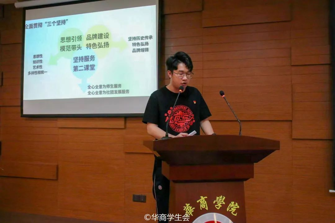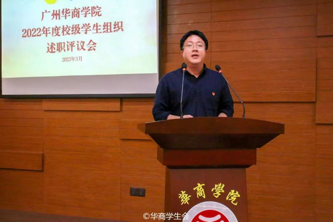 校团委社团管理部常委团成员叶东昇作述职汇报。在过去一年的工作实践中,始终秉承着“服务社团、管理社团”根本宗旨,有序推进组织工作,努力凝练学生社团工作的亮点特色,坚持思想引领和品牌建设,发挥模范带头作用;坚持服务宗旨,发挥学生社团第二课堂作用,为华商校园文化添砖加瓦。未来,校社管将继续贯彻全心全意为师生服务、全心全意为社团发展服务理念,着重完善社团成员维权渠道与社团服务管理机制,丰富和促进校园文化建设,持续将党的二十大精神落实到以社团组织为载体的历练成长与打造社团品牌上,真正发挥学生社团落实立德树人根本任务,推进素质教育的作用。
