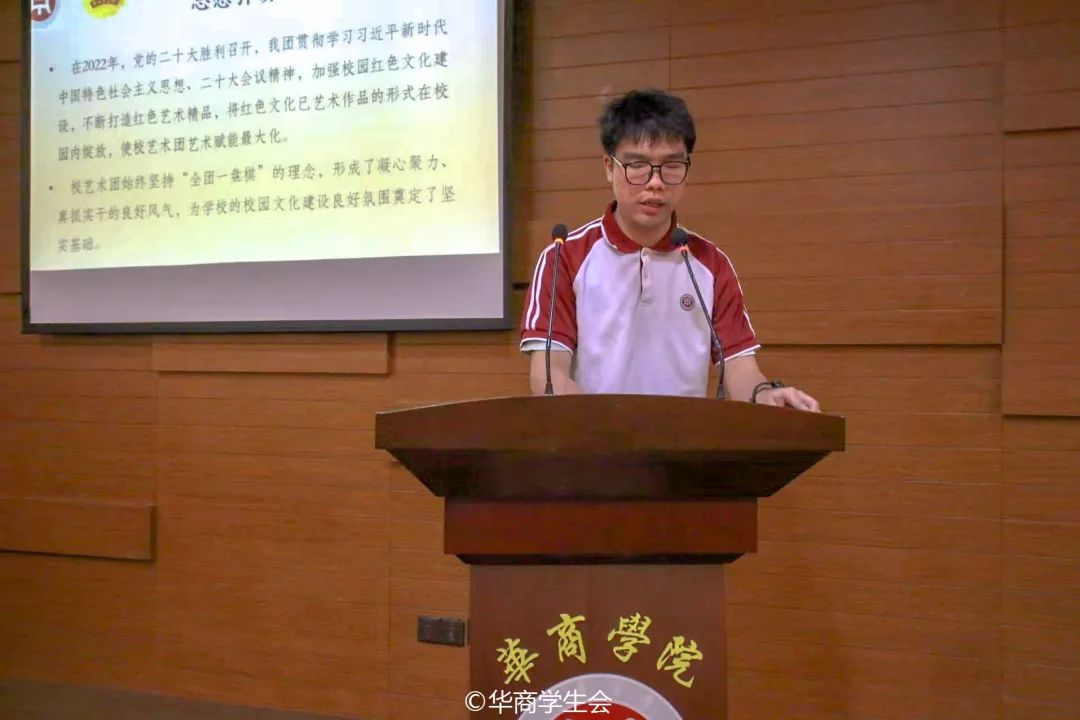 校飞跃艺术团常委团成员叶浩林作述职汇报。2022年,党的二十大胜利召开,校飞跃艺术团贯彻学习党的二十大精神,加强校园红色文化建设,不断打造红色艺术精品。艺术团坚持优化组织架构,在疫情防控常态下进行云端艺术传播。在校团委的指导下,校飞跃艺术团将继续保证艺术品质,坚持艺术创新,不断提高品牌价值。