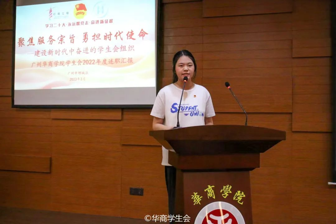 校学生会主席团成员黄朵懿作述职汇报。过去一年,校学生会把握时代脉搏,深学笃行党的二十大精神,通过定期召开灯塔学习会,组织专题理论研讨活动,强化思想政治引领。深化组织改革,深化“校−院−班”三级联动,落实校院两级学生会工作人员培训全覆盖,建立年度述职评议。倾听同学心声,聚焦同学需求,开展十大歌手、模特大赛、“新生杯”篮球赛等校园精品活动,丰富校园文化生活,积极发出青年声音。搭建线上服务直通车平台,通过华商小斑马系统,为同学们提供便利服务。未来校学生会将继续做到心中有责、肩上扛责、行动尽责,以更加务实的担当作为、更加奋发进取的精神状态和奋斗姿态踏上新征程,为建设新时代中奋进的学生会组织,贡献青春力量。
