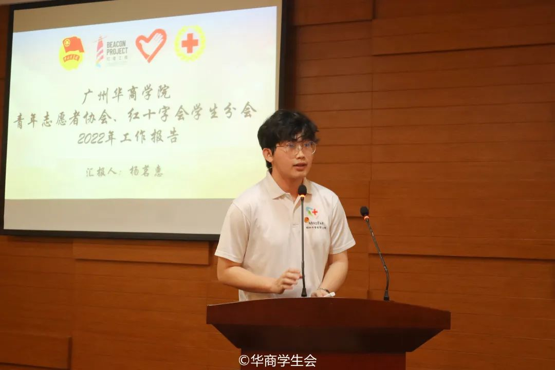 校青协红会常委团成员杨茗惠作述职汇报。2022年,校青红协助开展校内核酸检测100余次,组织10000+名志愿者同心抗“疫”,彰显青年担当。开展“云辅导”线上志愿工作,组织学生志愿者投身乡村各地,为乡村生态、文化、规划、治理、驻镇帮扶等工作贡献光热。组织开展双校区学生无偿献血活动,让爱在帮扶中凝聚。多次协助大型考务工作,温情伴考,为华商学子保驾护航。组织三下乡实践队下基层进行义教和乡村产业发展调研,讲好乡村振兴故事。