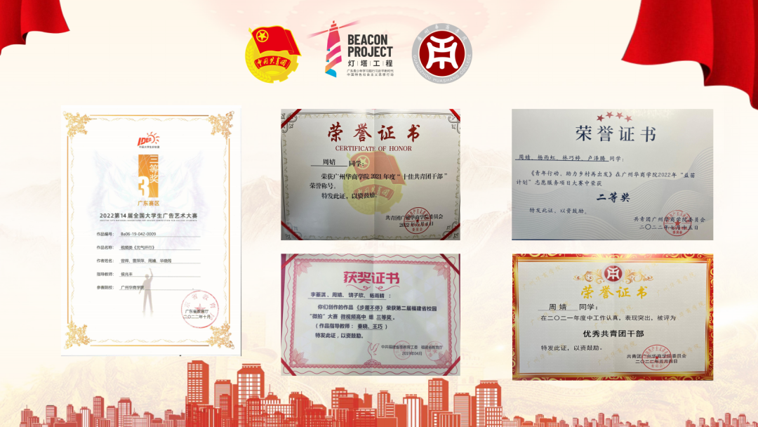 坚持不懈,收获硕果累累。周婧同学积极参加校内外多项竞赛,锻炼各方面能力素质。曾获福州外国语学校“优秀共青团员”、2022广东省大学生科技创新专项资金哲学社会科学调查报告与学术论文类立项项目、第十四届全国大学生广告艺术大赛三等奖、第十五届大学生科技学术季活动之广东大学生社会治理调研大赛三等奖、伟德体育“十佳共青团干部”、伟德体育“优秀生”一等奖学金等。