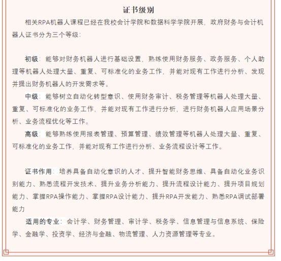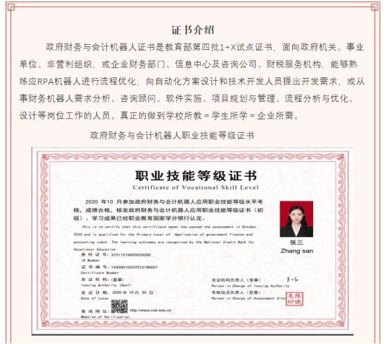 文件提出,扩大本科及高职院校证书试点,有利于提高学生核心竞争力促进就业,深化产教融合和“岗课赛证”综合育人模式改革,提高国家高技能应用人才发展。目前华商学院已就“政府财务与会计机器人职业技能等级证书”向广东省教育厅及教育部证书管理平台提出申请考核试点并于5月8日审核批准,接受今年下半年及2024年欲参加考试同学咨询。