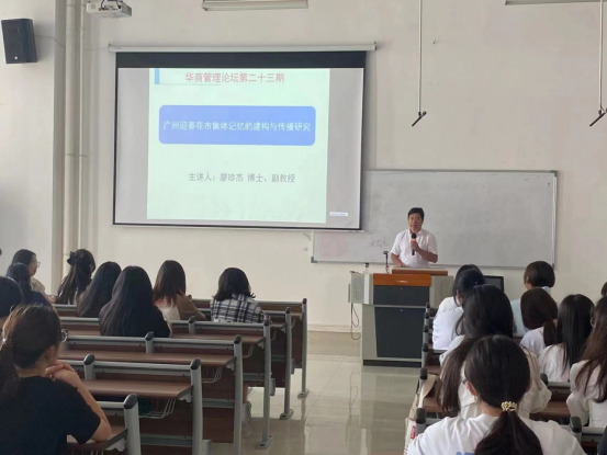 2023年9月19日下午16时,伟德体育管理学院于四会校区6号楼201教室举办“广州迎春花市集体记忆的建构与传播研究”讲座。此次讲座由管理学院院长助理廖珍杰副教授主讲,四会校区各学院学生代表340余人聆听了本次讲座。