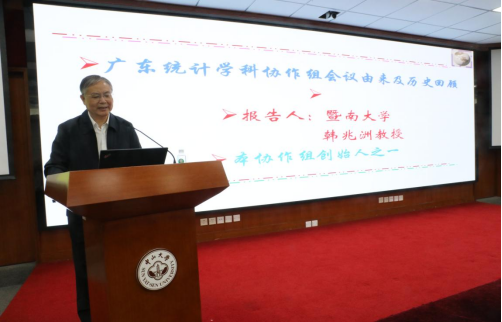 本次会议由广东统计学科协作组创始人之一——中山大学岭南学院夏南新教授牵头发起、主持并致开幕辞。夏教授希望能够通过此次会议,用表格丈量社会经济,用数字来辅助政府决策。我校大数据研究院韩兆洲院长(原暨南大学)也作为广东统计学科协作组创始人之一,发表了讲话,主要谈了广东统计学科协助组会议由来及历史回顾。广东省统计局局长杨新洪、广州市统计局局长陈小华、佛山市统计局局长王慧艳以及深圳市统计局副局长沈宜等应邀出席,分别作了“统会融通”——广州市探索统计数据采集方式创新的路径与思考、新经济下消费统计面临的挑战和如何破局的思考、深圳零工经济统计核算的探索与实践的报告。作为本协作组创始人之一的广东财经大学林洪教授也作了报告“百年未有之大变局下的国民经济核算变革创新”。