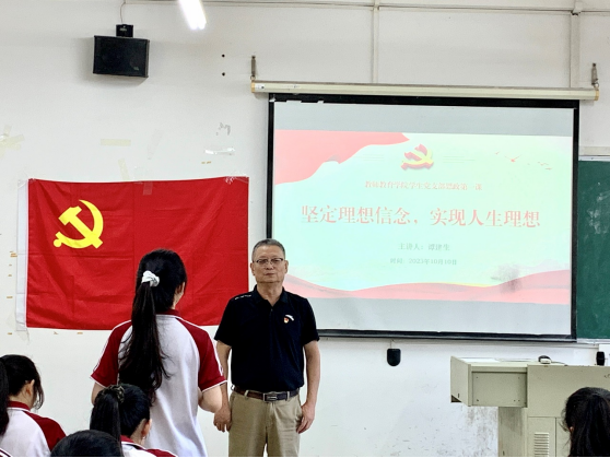 谭建生老师以“坚定理想信念,实现人生理想”为主题,围绕中国历史发展进程、党的历史、改革开放、社会主义现代化建设历程四个方面进行分析并谈论其中重要意义。百年风雨兼程,数不尽的坎坷沧桑;百年风云巨变,道不尽的丰功伟业。无数先烈们用热血染红了党旗,历经重重磨难,取得伟大的胜利。在这百年之际我们党带领人民艰苦奋斗,建成今日幸福的小康社会。