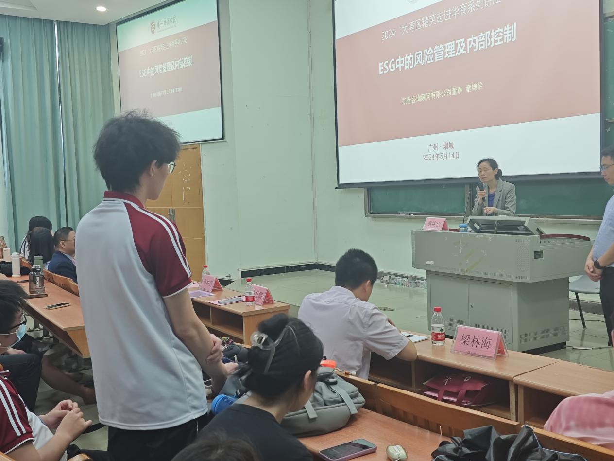 2024年5月14日,大湾区精英走进华商系列讲座(第六场)暨管院大讲堂-启智系列讲座(第四场)在广州校区励志楼D208举行。讲座主题为“ESG中的风险管理及内部控制”,特邀香港凯晋管理咨询有限公司董事童锦怡女士作为主讲嘉宾。讲座围绕企业风险管理系统–COSO框架的元素及其应用、企业风险管理与内部控制的关系等方面进行了深入探讨。