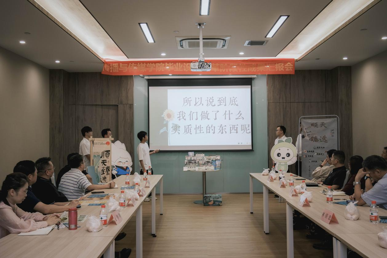 5月23日,传播与传媒学院在中央图书馆教师发展中心举办广告系本科毕业设计改革阶段性成果汇报会。广告学系毕业设计“顺天甄选”团队展示了他们为当地农产品和乡村文旅项目的营销推广策划方案。学校副校长范忠宝、教务处处长金伟娇、就业创业处处长曾龙威、校团委书记陈刚、传播与传媒学院及广告系负责人共同听取了汇报。