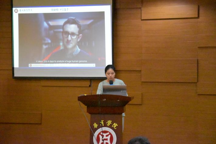 随后,9位决赛选手轮流登场,通过为一位外籍友人走访中国现代化企业和科研院所的英语纪录片现场配音的方式,展现他们的英语口语水平以及对新质生产力的理解。