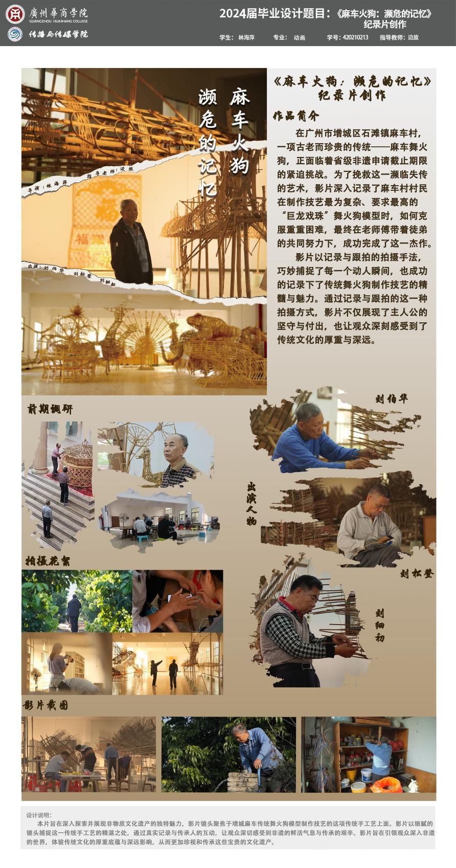 增城荔枝木雕刻非遗传承人李化林老师对进行非遗纪录片创作的学生进行了称赞和鼓励。他肯定了纪录片创作对非遗文化的宣传作用,并对毕业展的举办表示大力支持。李化林老师表示,纪录片创作对于非遗文化的宣传与传播起到了很大的作用,这几年有许多学生都拍摄了荔枝木雕刻非遗纪录片,质量较往年也逐渐提升,非常感谢学校以及同学们对增城荔枝木雕刻的宣传与推广。
