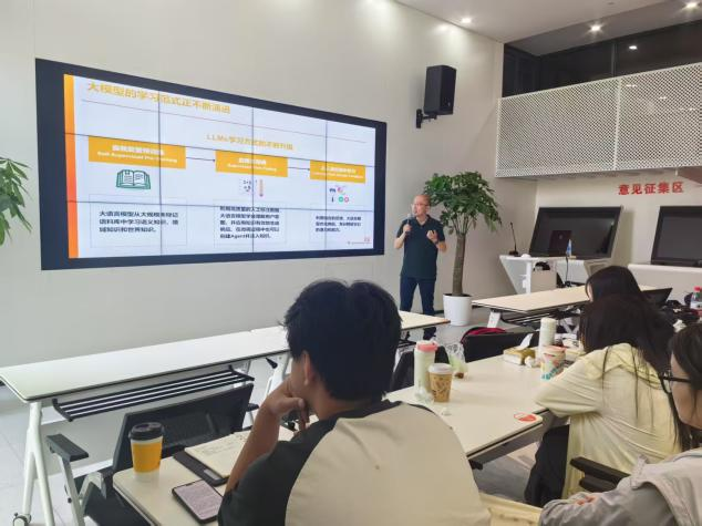 活动首站,学院特邀数据智能科学家张恺博士担任主讲。张恺深耕人工智能及大数据领域15年,现任上海开源技术协会金融智能专委会副主任,曾主导多项国家级行业标准制定,并在金融智能、大模型应用等领域发表十余篇前沿论文。作为东方财富人工智能研究员、华为云认证专家,他结合自身在智能风控、个性化推荐等领域的实战经验,深入剖析AI技术如何赋能金融场景,为学生们揭开了智能投研、算法驱动的金融创新等核心议题的实践路径。