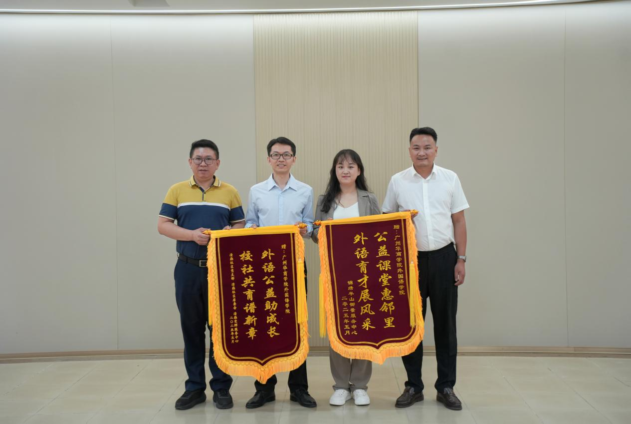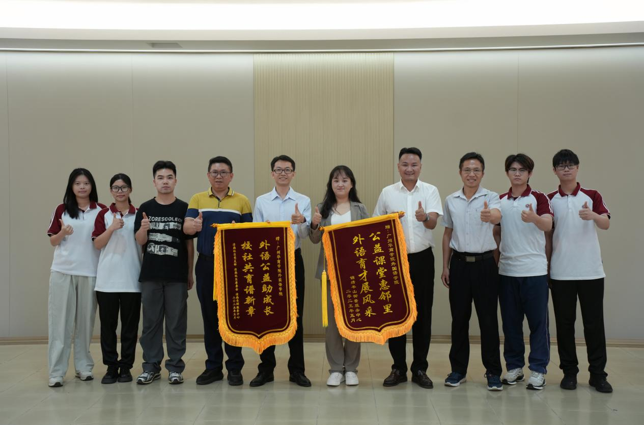5月13日上午,伟德体育外国语学院与增城区清燕社区、锦绣半山御景花园小区物业联合举办的“晚风学堂”英语晚辅公益项目赠锦旗仪式在创新楼403-2小会议室举行。清燕社区邓镜波书记、锦绣半山御景花园小区物业陈勇经理、外国语学院何顺发副院长及“晚风学堂”项目组全体成员共同见证这一校社协同育人的温暖时刻。“晚风学堂”不仅体现了外院学子践行社会责任的热忱,更是校社双向奔赴、共筑教育公益新模式的生动缩影。