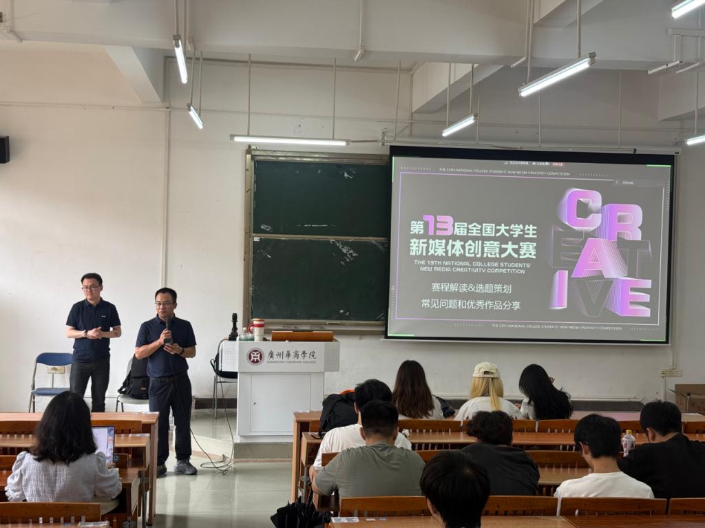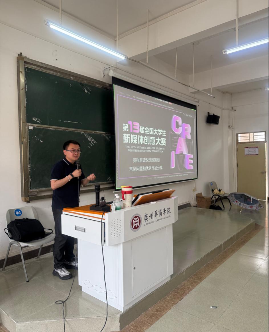 2025年5月20日下午,第13届全国大学生新媒体创意大赛宣讲会在伟德体育广州校区励志楼C402举行。北大方正资深讲师张志宇为网络与新媒体专业2022级、2023级、2024级学生深度解读赛事规则、创作方向及行业趋势,现场座无虚席,互动热烈。宣讲会由数字传播学院网络与新媒体系主任张志荣副教授主持。