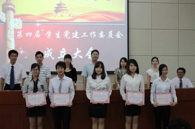 2011年10月11日下午15:00,广东商学院华商学院第四届学生党建工作委员会成立大会于励志楼C208隆重举行。学院党委组织科副科长杨宪老师、学生党建工作委员会书记招韵雯老师、学生党建工作委员会指导老师陈伯兴老师、谢思梅老师,书记助理钟承敏同学、第三届和第四届学生党建工作委员会常委及干部、各党支部新老支委等300多人参加了大会。大会由第三届学生党建工作委员会秘书长彭瑞君同学主持。